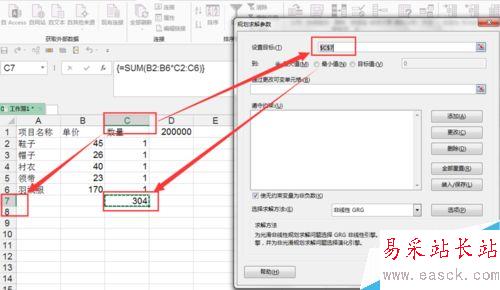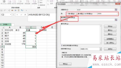 5、對應好單元格高,填寫目標值的單元格。其次同樣設置最大值,在這個問題中我們的值就是20萬。其次還有一些基本的需要調整的單元格內容的選取。