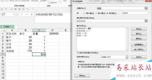 6、最后就是對這個問題的一種約束條件。比如說這里的所有商品都為整數,且都至少買一件,還有羽絨服至少買20件,帽子30個等等,看我們怎么來做的。選擇【添加】。