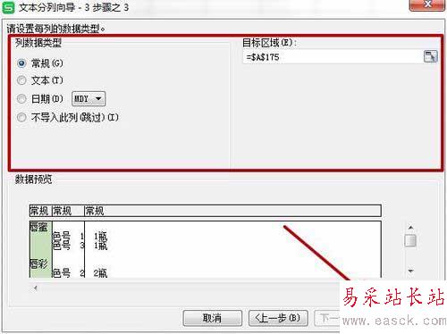 9、設置分列文本的數據類型和單元格區域。這邊一般不用修改。單擊【完成】即可。