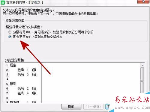 5、彈出【文本分列向導】,選擇【分隔符號】或【固定寬度】。根據內容文本格式選擇合適的方法。這邊以【固定寬度】為例。