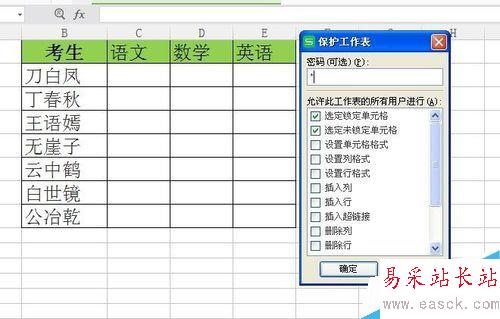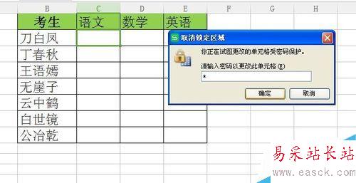 6、完成以上步驟之后,三個科目的限制用戶編輯就完成了。需要編輯語文成績,則需要輸入先前設置的密碼才能完成。