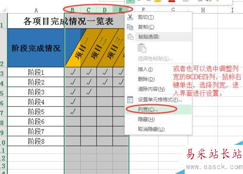 5、調(diào)整列寬。需要調(diào)整幾列的寬度一致,可以將B/C/D/E幾列一起選中,方法還是在所示區(qū)域用鼠標(biāo)拖動(dòng)選擇。選中后,調(diào)整任意一列寬度,幾列寬度就會(huì)同時(shí)變化。