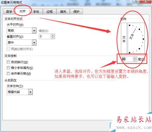 2、進(jìn)入界面后,選擇對(duì)齊,在右上角調(diào)整文本傾斜度數(shù),可以直接調(diào)整指針,也可以在框內(nèi)輸入度數(shù),進(jìn)行調(diào)整。調(diào)整好后,單擊確定。