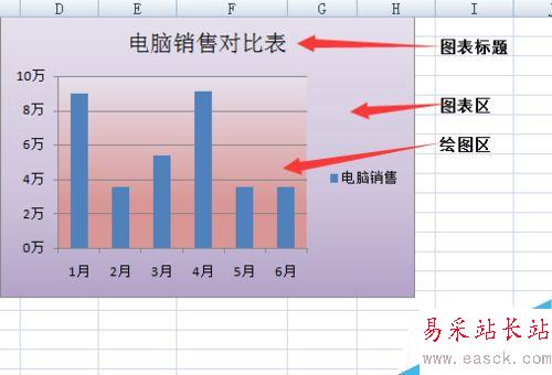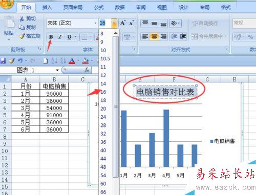 雙擊圖表標題區(qū)—在“電腦銷售”后面再輸入“對比表”—輸入完后,選中標題“電腦銷售對比表”—將加粗去掉,并把其字號設置成合適的大小;