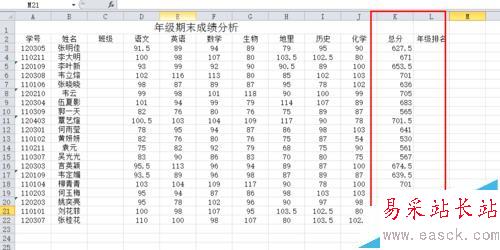 1、首先打開我們原有的成績表,在表格最右邊各列分別輸入“總分”“年級排名”,如圖