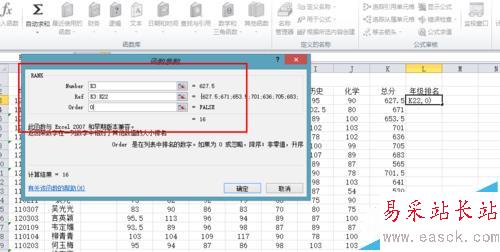 6、點擊確定就會彈出一個對話框,我們在框中的number中選中第一個同學的總分K3框,在Ref中選中所有同學的總分K3:K22,在Order中輸入0,然后點擊確定,就會得出第一個同學的排名,再用填充柄填充其他同學的排名,如上
