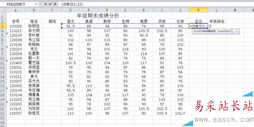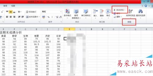 2、接下來,點擊總分下的一個框K3,再點擊“開始”菜單“編輯”里的“自動求和”,此時表格就會自動框選出你要求和的數據,再按“Enter”,總分就會出來