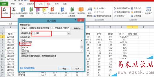 5、點擊L3單元格,再在“公式”中“插入函數”找到“全部”下的“RANK”,如圖