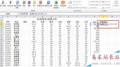 7、或者直接在單元格L3中輸入“=RANK(K3,K$3:K$22,0)”,按Enter,再用填充柄填充即可。