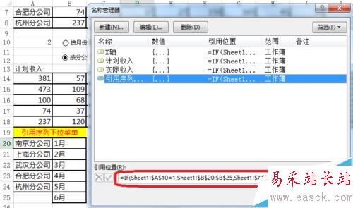 3、點擊公式——名稱管理器。建立名為引用序列下拉菜單的名稱,輸入公式=IF(Sheet1!$A$10=1,Sheet1!$B$20:$B$25,Sheet1!$A$20:$A$24)