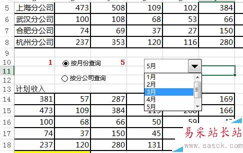 5、效果如圖所示,點擊按月份查詢——A10=1,點擊組合框控件5月——C10=5。