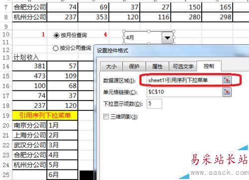 4、插入組合框(窗體控件)——設置控件格式。數據源區域=sheet1!引用序列下拉菜單。sheet1!為固定形式——引用下拉菜單為定義的名稱。這時達到的效果是=IF(Sheet1!$A$10=1,Sheet1!$B$20:$B$25,Sheet1!$A$20:$A$24)。