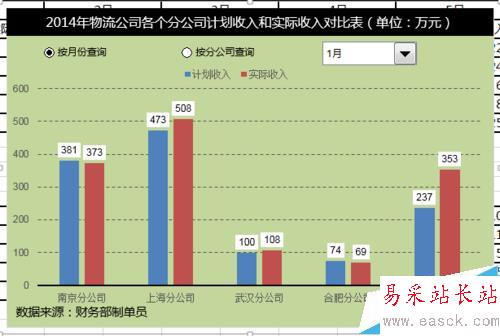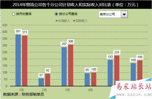 2、Excel動態圖表要達到的效果,如圖所示。按月份查詢——按分公司查詢,一張動態圖表相當于多張普通圖表達到的效果,用于數據的分析非常有效。