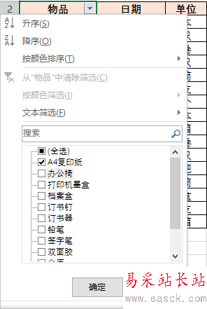 點擊下拉箭頭按鈕,其中已自動提取出這一列中的數據選項了。如果我們只想看復印紙購買了多少,那么去除其他選項,只勾選復印紙這項。