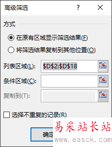現在點擊工具欄“排序與篩選”中的“高級”,將會打開高級篩選對話框,其中列表區域已自動填充。