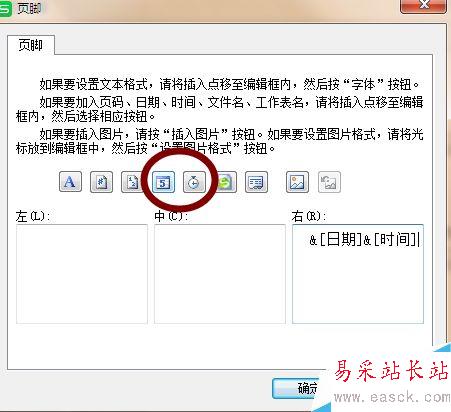 4、然后選擇左右中,然后點擊日期和時間的圖標,設置好之后點擊確定,如圖