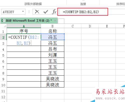 3、在C2中輸入=countif(B$2:B2,B2)。