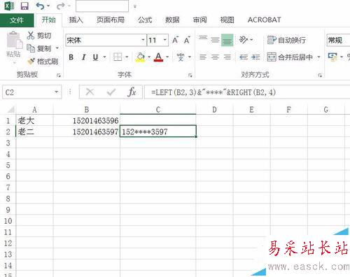 3、然后輸入公式:=LEFT(B2,3)&"****"&RIGHT(B2,4)