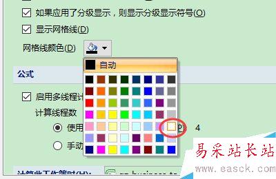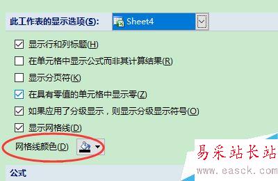 4、將滾動條往下拉,找到此工作表顯示選項,這一組最下面可以設置網格線顏色。
