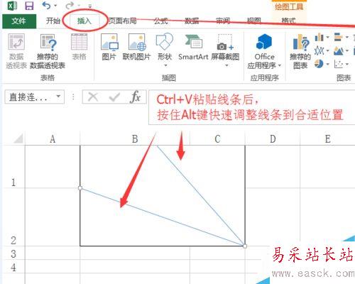 2、調(diào)整斜線位置:按住Alt鍵調(diào)整線條位置。選定線條,按鍵Ctrl+C復(fù)制線條,Ctrl+V粘貼線條后,按住Alt鍵快速調(diào)整線條到合適位置。