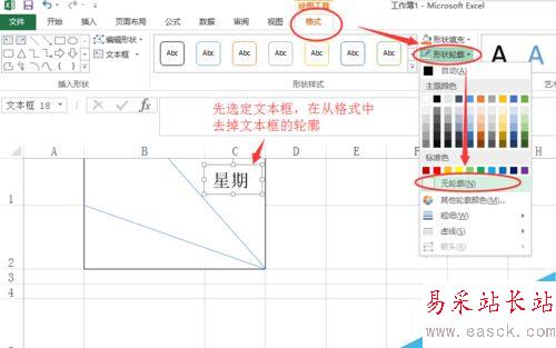 4、去除文本框輪廓:選定文本框,選擇“格式”-“文本輪廓”,在下拉菜單中選擇“無輪廓”,去掉文本框輪廓。