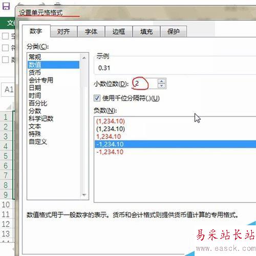 打開設置單元格格式的對話框后,選擇數值并保留2位數字,如下圖所示: