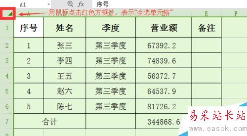 2、然后全選excel的整個單元格,即用鼠標點擊表格最左上角的方框,如圖紅色方框處,則表示全選單元格,如圖所示;