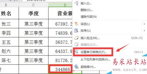 4、然后點擊有公式的格子,再點擊鼠標右鍵,選擇“設置單元格格式”(或者用快捷鍵“Ctrl鍵”+“1鍵”代替),如圖所示;