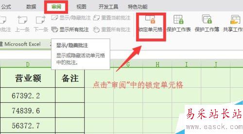 3、再點擊excel表格最上方功能菜單中的“審閱”按鈕,然后選擇其中的“鎖定單元格”按鈕,如圖所示;