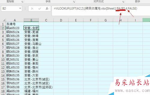 6、突然領(lǐng)導(dǎo)說(shuō)想要知道在那個(gè)市!還好我們有數(shù)據(jù)儲(chǔ)備,直接把函數(shù)VLOOKUP(LEFT(A2,2),[牌照歸屬地.xlsx]Sheet1!$A:$C,2,FALSE)中,F(xiàn)ALSE之前的2改成3,對(duì)應(yīng)歸屬地?cái)?shù)據(jù)的C列,然后填充到后面所有行就完成了