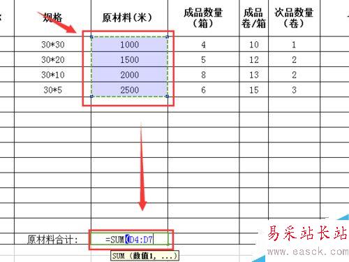 4、求和函數的應用。在要輸入求和值得單元格內輸入“=sum(”,然后按照上面介紹的選擇的單元格的選擇要求和的單元格。最后敲下“enter”即可自動完成求和運算。