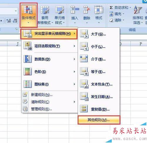 3、單元格被選擇的情況下,在開始->樣式中點擊條件格式->突出顯示單元格規則->選擇其他規則。依次操作后會彈出新建格式規則小窗口。