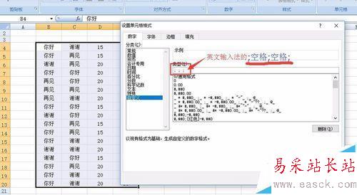6、然后點擊下面的格式,在彈出的設置單元格格式窗口中選擇數字->自定義,在右側的類型中輸入; ; ;(英文輸入法的分號+空格+分號+空格+分號),輸入完成后一路點擊確定。