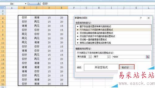 4、在選擇規則類型中選擇只為包含以下內容的單元格設置格式,在編輯規則說明中選擇單元格值和等于。