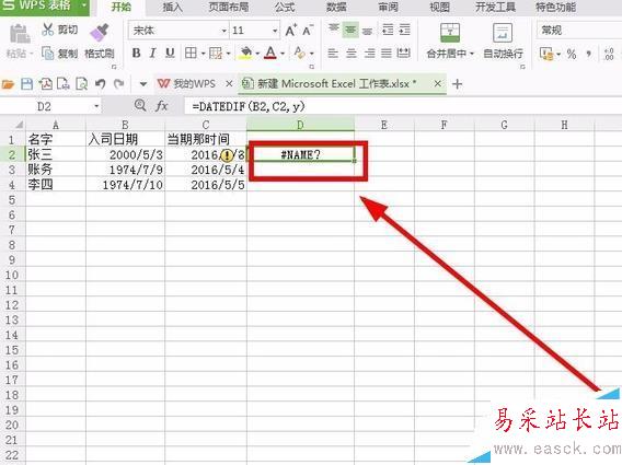 6、按回車鍵后,你發(fā)現(xiàn),此時(shí)計(jì)算工齡那表格里出現(xiàn)了錯(cuò)誤提示:#NAME?,這是什么原因?qū)е碌哪兀聪乱徊?/p>