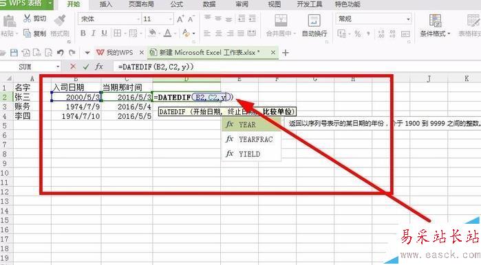 5、DATEDIF輸入后會(huì)跳出提示。開始日期,終止日期,比較單位,如圖所示,鼠標(biāo)點(diǎn)擊入司日期,點(diǎn)擊完后加英文字符的逗號(hào),再點(diǎn)擊當(dāng)前日期,點(diǎn)擊完后加英文字符的逗號(hào),輸入字母y