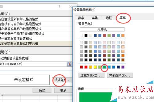 5、設置好公式后,需要對符合公式的單元格設置格式,單擊格式按鈕。在設置單元格格式窗口中,打開最后一個頁簽,填充,這里我選擇了綠色。