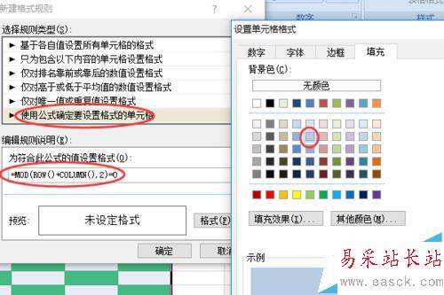 7、我們再次選擇剛剛設置的區域,單擊條件格式中的新建規則,這次我們輸入公式:=MOD(ROW()+COLUMN(),2)=0,并將設置底紋為淡藍色。