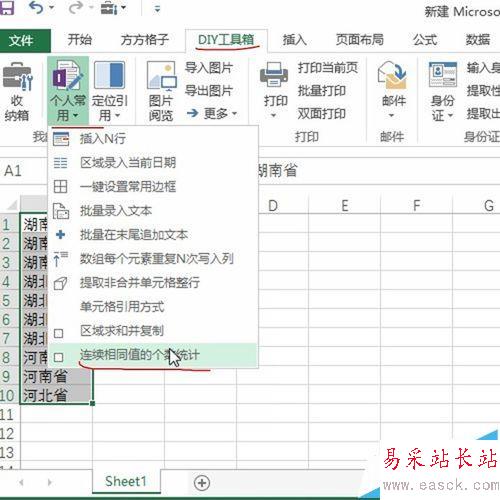 5、最后選擇刪除首行并選擇區(qū)域數(shù)據(jù),接著選擇diy工具箱中的個(gè)人常用中的連續(xù)相同值的個(gè)數(shù)統(tǒng)計(jì)按鈕,如下圖所示: