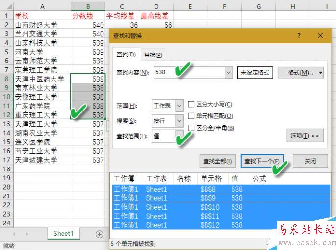 用Ctrl+F查找,按指定范圍,指定值進行精準定位。在查找的結(jié)果中用Ctrl+A全選后,表中所有符合條件的單元格即被自動全部選中。