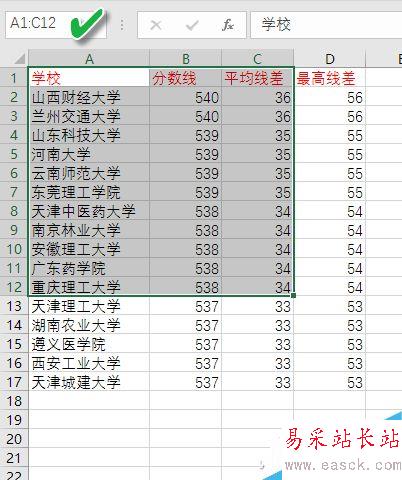 使用表格上方左上角的名稱框,輸入單元格區(qū)域坐標(如輸入A1:C12),可快速選擇指定的單元格或單元格區(qū)域。