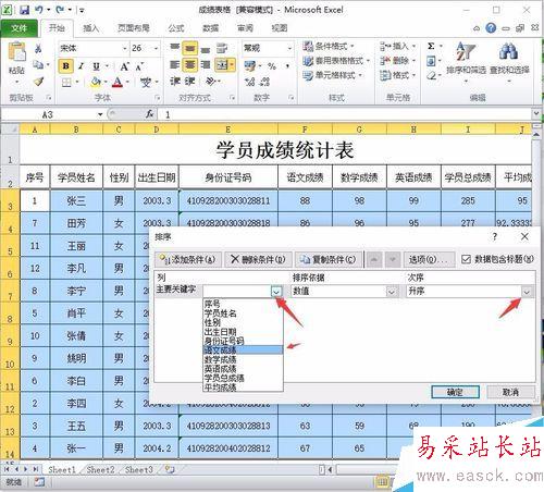 3、就可以看到一個彈出的對話框,在對話框中,可以選擇“排序的依據、排序的方式”等類目,根據用戶的選擇進行篩選,圖中選擇的是“數學成績和升序”的模式。