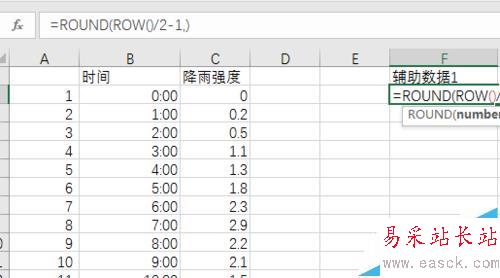 2、接下來我們需要做一些輔助工作。構造輔助數據1,并在F2輸入“=round(row()/2-1,),這樣可以得到重復的序列