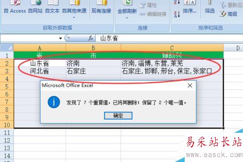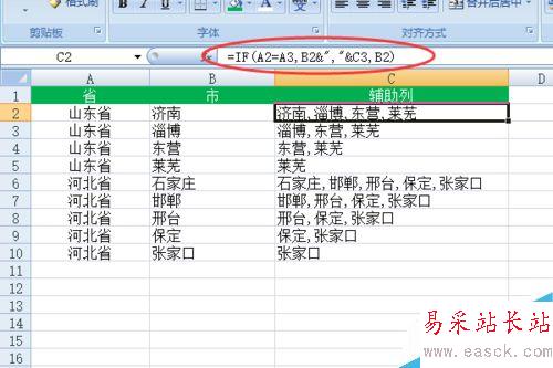 3、每個省份第一次出現的那行,顯示的是這個省份的所有城市用逗號連接起來的文本。復制輔助列,并在輔助列原位置進行選擇性粘貼,只粘貼值。