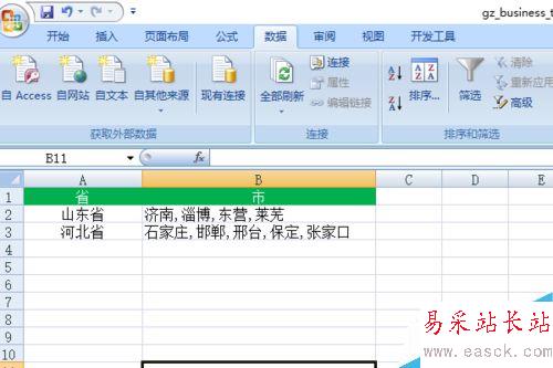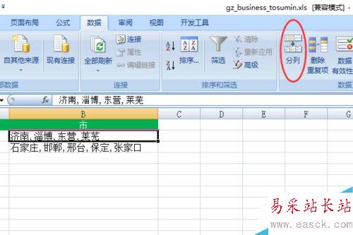 5、數據分列后,可以看到市已經分到不同的單元格了。