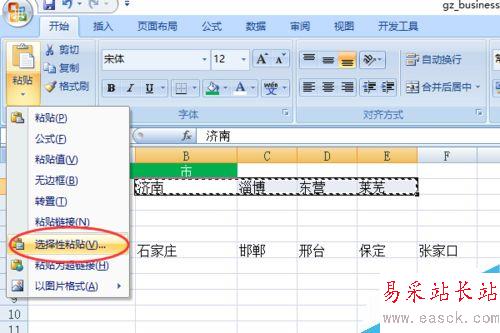 7、選擇山東的地市進行復制,然后使用選擇性粘貼,