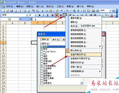 右鍵工具欄的合并居中圖標——把樣式修改為總是只用文字——關閉自定義界面