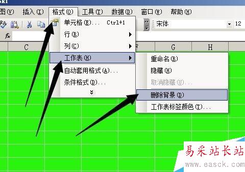 6、若我們想把綠色背景取消。在菜單欄中順序點(diǎn):格式--工作表--刪除背景。