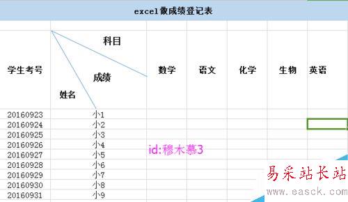 2、我們要做的是,將excel表顯示的更直觀好看些。成績、科目和姓名在一個格子里,如下圖的成品顯示。