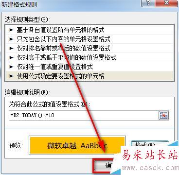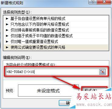 6、在下面的輸入框內輸入公式=B2-TODAY()<=10,然后點擊【格式】按鈕。